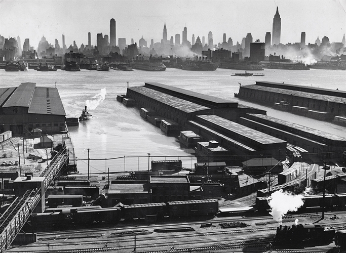 © Esther Bubley, untitled view of Brooklyn piers and Manhattan across the East River, NY, 1946